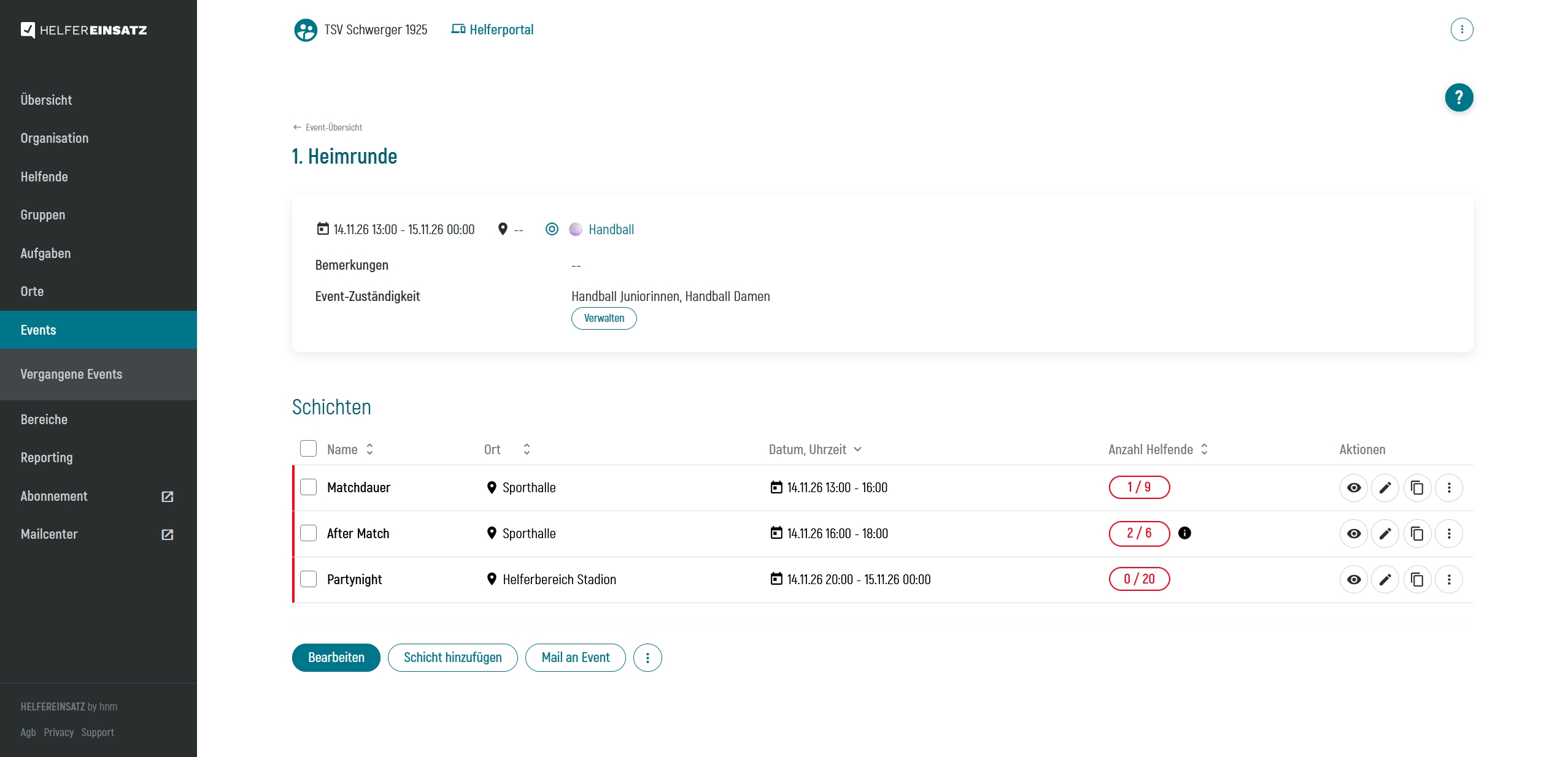 Wenn du einer Gruppe Zuständigkeiten zugeteilt hast, sehen die Gruppenmitglieder als erstes die Events, für welche ihre Gruppen als zuständig markiert sind. Erst wenn alle passenden Einsätze der zuständigen Events vergeben sind, werden die Events im Portal wieder normal nach Datum sortiert angezeigt.